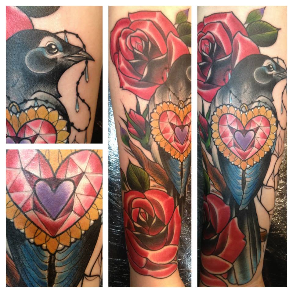 I originally started my tattooing venture with a goal of working in photo-realism, my portfolio was made up of 90% portrait & animal studies, which is probably quite a surprise to most. However, I was personally collecting lots of traditional tattoos on myself and as a popular style, my friends would let me practice the same style on them…and then it just went from there really! I wasn’t working with anyone who worked in realism or black and grey and so I didn’t feel confident enough to explore that route without any guidance.